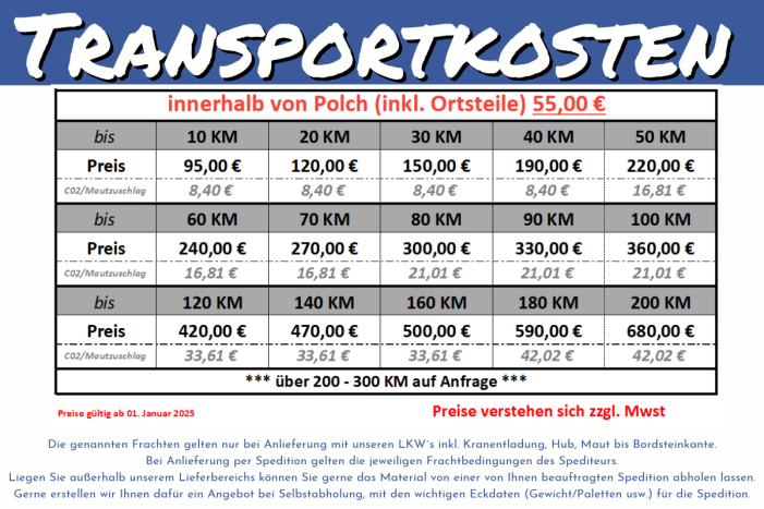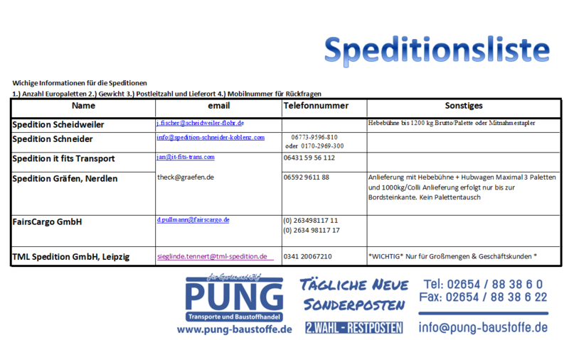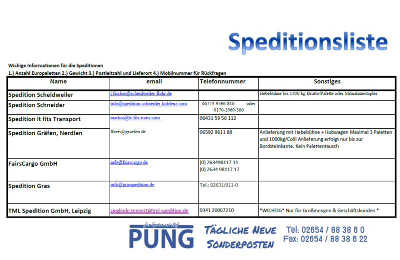 1.) Anzahl Europaletten 2.) Gewicht 3.) Postleitzahl und Lieferort 4.) Mobilnummer für Rückfragen